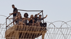 Un gruppo di giovani israeliani è stato fotografato su una torre di osservazione al confine con Gaza mentre assiste, facendo il tifo, alla rappresaglia dell’esercito di Tel Aviv contro i manifestanti palestinesi.