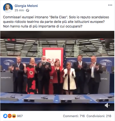 Immediato il commento di Giorgia Meloni, che ha subito pubblicato il video sulla sua pagina Facebook, scrivendo: “Commissari europei intonano ‘Bella Ciao’. Solo io reputo scandaloso questo ridicolo teatrino da parte delle più alte istituzioni europee? Non hanno nulla di più importante di cui occuparsi?”