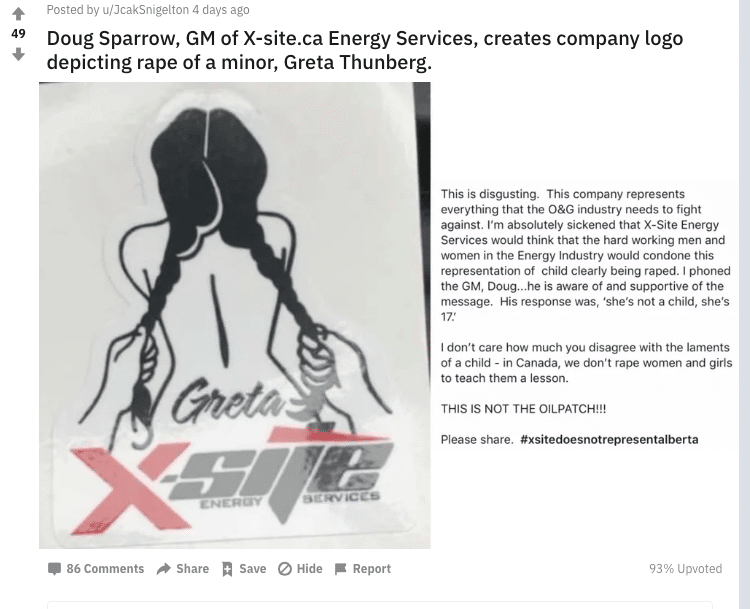 Al direttore generale dell’azienda X-Site, Doug Sparrow, è stato chiesto se fosse a conoscenza dell’adesivo contro Greta Thunberg che sembra raffigurare lo stupro di un minore. Il general manager ha risposto di esserne consapevole e la sua risposta è stata: “Non è una bambina, ha 17 anni”.
