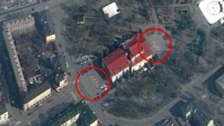 Mariupol, nel cortile del teatro bombardato la scritta “bambini” in russo: le immagini satellitari