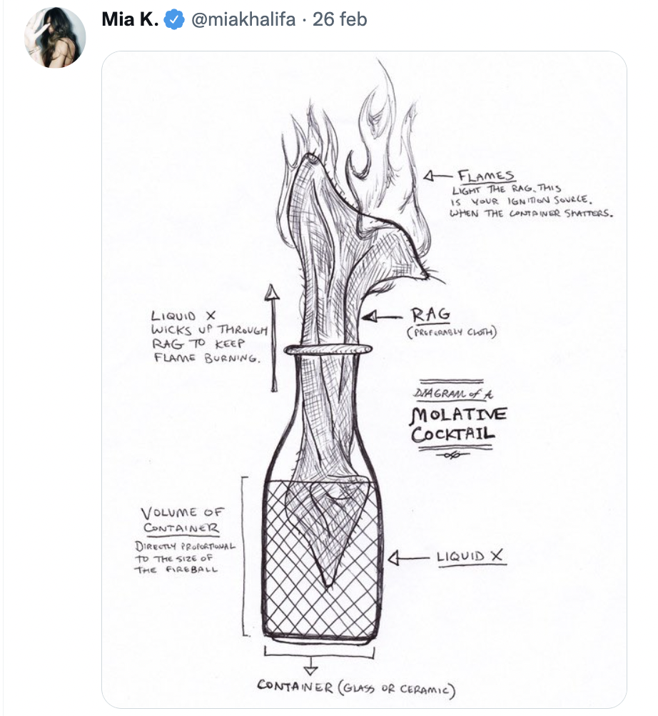 La “leggenda” del porno Mia Khalifa ha scioccato i suoi 4 milioni di fan su Twitter condividendo in un post quantomeno controverso le istruzioni per costruire una bomba molotov dopo l’invasione russa in Ucraina.