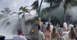 In queste ore, circolano sui social le immagini dell’acqua che invade le città dell’isola. In un video, un’onda scaraventa sedie e tavolini durante i festeggiamenti di un matrimonio a Kailua-Kona. Alcuni presenti non riescono a scappare e vengono colpiti dall’acqua.