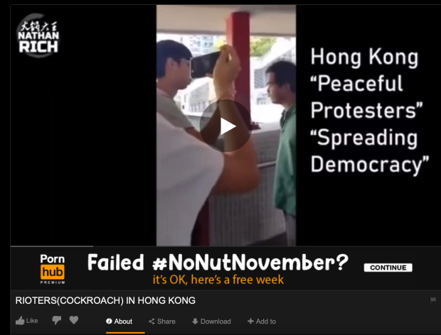La celebre opinionista social non ha specificato quali fossero i video caricati sul sito porno, ma le ricerche condotte da Quartz mercoledì 13 novembre con frasi come “Hong Kong rioters” hanno dato come risultato almeno una dozzina di video che mettono in cattiva luce i manifestanti della ex colonia britannica.