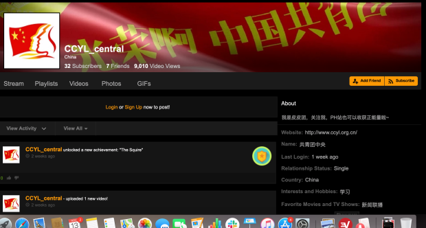 Sei di loro provenivano da un canale chiamato “CCYL_central” che si è iscritto tre mesi fa, finora su PornHub ha caricato 11 video. Il canale descrive il suo acronimo come Lega della Gioventù Comunista Cinese, ma è improbabile che sia effettivamente affiliato all’ala giovanile del Partito Comunista. L’account ha totalizzato finora 9mila visualizzazioni e 32 seguaci.