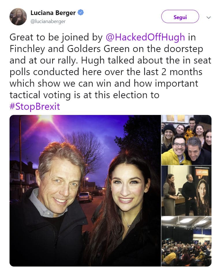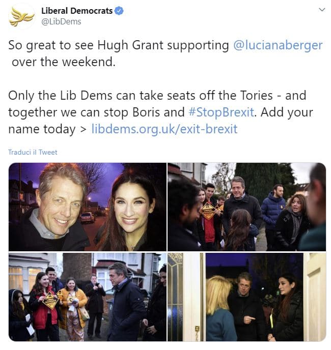 Questa volta l’attore inglese, interprete di “Nothing Hill” e “Quattro Matrimoni e un funerale”, ha deciso di accompagnare la candidata libdem nelle case dei cittadini per convincerli a rimanere nell’Unione Europea e opporsi alla campagna pro Brexit di Boris Johnson, definito da Grant un “giocattolo di gomma” e un politico “che riesce a pensare solo a se stesso e alla sua carriera”.