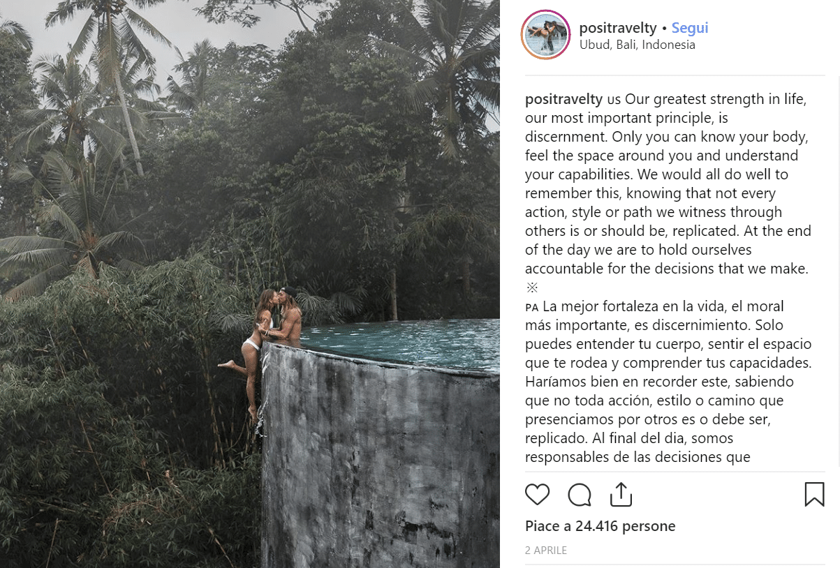 “La nostra più grande forza nella vita, il nostro principio più importante, è il discernimento. Solo tu puoi conoscere il tuo corpo, sentire lo spazio intorno a te e capire le tue capacità”, si legge nella didascalia dell’immagine, postata su Instagram. Un alto numero di like pari al rischio corso dalla giovane influencer. Kelly e Kody hanno sicuramente raggiunto il proprio obiettivo: la fotografia ha superato i 23mila like, un numero che i loro post non hanno mai visto prima.