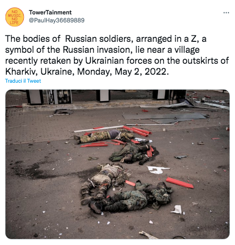Alcune immagini riprese dagli inviati dell’Associated Press nei sobborghi di Kharkiv, in Ucraina, mostrano i corpi di quattro soldati russi disposti a forma di “Z”, la lettera che campeggia sui veicoli dei blindati di Mosca diventata simbolo dell’invasione russa. I cadaveri sono stati ritrovati dopo la riconquista, da parte delle forze ucraine, di uno dei villaggi che sorgono intorno alla città. A indicare che si tratta di militari russi le fasce bianche da braccio comunemente associate all’esercito di Putin. Accanto ai corpi esanimi anche alcuni kit medici di provenienza di Mosca. Anche i soldati, come i civili e le altre vittime ritrovate nelle città da cui l’esercito russo si è ritirato, possono essere considerati vittime di un crimine di guerra, per il mancato di rispetto alla dignità dei morti. Dopo la visita dei giornalisti dell’Ap i corpi dei soldati sono stati rimossi e portati in un obitorio.
