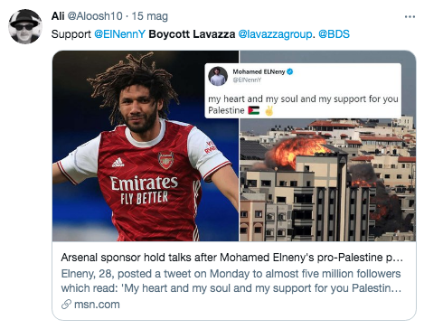 Il gruppo Lavazza ha fatto pressioni sul club londinese dell’Arsenal per redarguire il calciatore egiziano Mohamed Elneny che ha condiviso un Tweet in supporto della Palestina, dove dall’inizio del conflitto tra Israele e Hamas ci sono stati 220 morti, di cui 63 bambini, in particolare nella striscia di Gaza. I morti in Israele sono stati fino ad oggi 12.