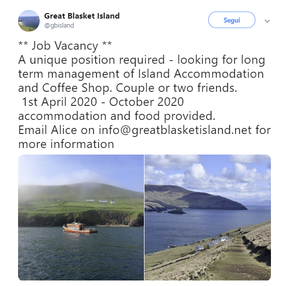 Sicuramente l’esperienza sulle Great Blasket non sarà delle più comode, ma permetterà un ritorno alle origini, come suggerito da Alice Hayes, che ha pubblicato l’annuncio di lavoro sui social. “Un lavoro intenso e duro, ma unico. Nessun giorno qui è uguale all’altro”.