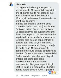 L’europarlamentare in un commento su Facebook ha ricordato l’assenza della partecipazione della Lega alla modifica del testo, che nella versione approvata dal Parlamento prevede “il ricollocamento automatico e permanente obbligatorio per tutti gli Stati”.