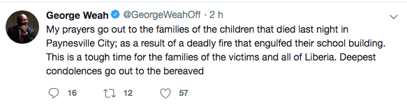 Il presidente della Liberia, l’ex calciatore del Milan George Weah, ha espresso il suo cordoglio su Twitter: “Prego per le famiglie dei piccoli morti la scorsa notte a Paynesville in seguito all’incendio nella loro scuola. Questo è un momento difficile per le famiglie e per tutta la Liberia. Le mie più sentite condoglianze – ha aggiunto Weah – alle famiglie in lutto e all’intera comunità islamica”.