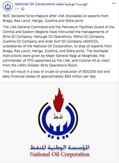 Ad annunciare la chiusura è la stessa Noc, in un post sulla sua pagina Facebook, in cui dichiara lo stato di “forza maggiore” dopo i blocchi Lna (il sedicente Esercito nazionale della Libia di cui Khalifa Haftar è comandante generale, ndr) dell’export di petrolio dai porti di Brega, Ras Lanuf, Hariga, Zueitina e Sidra”.
