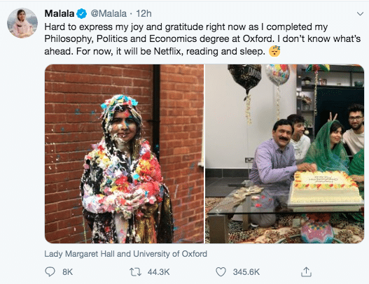Nel 2014 è diventata la più giovane attivista ad aver vinto il Nobel per la Pace per le sue campagne per l’emancipazione femminile e il diritto per le ragazze ad avere un’istruzione. Malala è entrata nel prestigioso campus britannico nel 2017. Aver ottenuto il diploma di laurea, per chi come lei ha sempre creduto che lo studio e l’istruzione fossero i valori più importanti da difendere, nel suo caso pericolosamente minacciati da un attentato, è la realizzazione di un sogno, e un segnale importante per le milioni di ragazze nel mondo che in lei ritrovano un simbolo. Una volta, la giovane pakistana dichiarò in un’intervista: “Non mi importa di dovermi sedere sul pavimento a scuola. Tutto ciò che voglio è l’istruzione. E non ho paura di nessuno”.