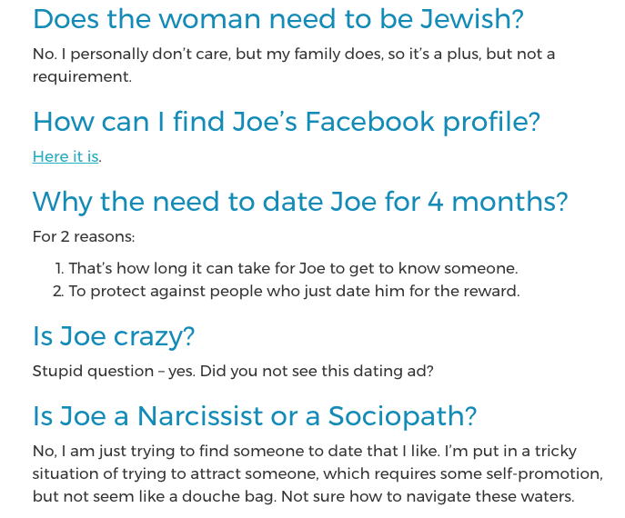 La somma, infatti, sarà consegnata solo se Joe e la ragazza che gli sarà presentata riusciranno a frequentarsi per almeno quattro mesi. Joe sul suo sito ha pubblicato un vero e proprio annuncio, dettagliatissimo, in cui spiega di avere difficoltà a conoscere donne che non siano sue colleghe, e di voler trovare una fidanzata.