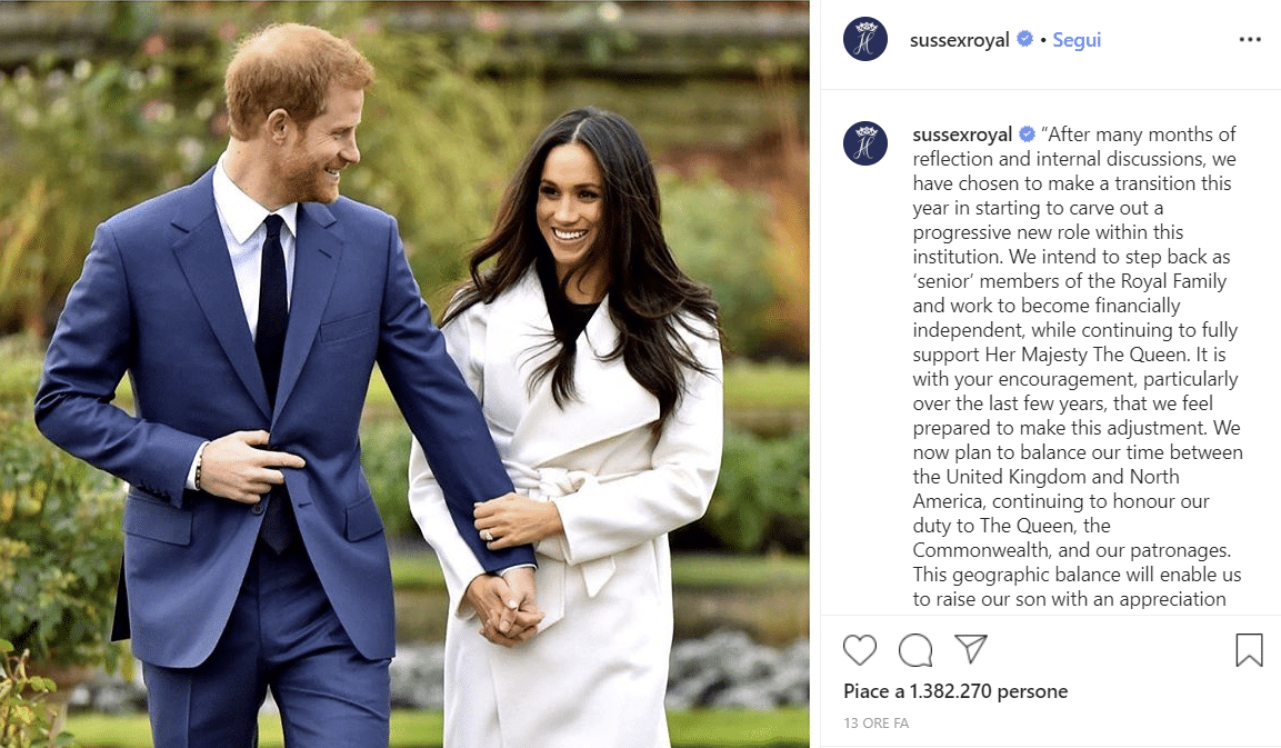 L’annunci delle nuove intenzioni dei duchi di Sussex è arrivata tramite la loro pagina ufficiale Instagram: “Abbiamo deciso di fare un passo indietro come membri anziani della Famiglia Reale e di lavorare per diventare finanziariamente indipendenti, continuando a supportare ciecamente Sua Maestà la Regina”.