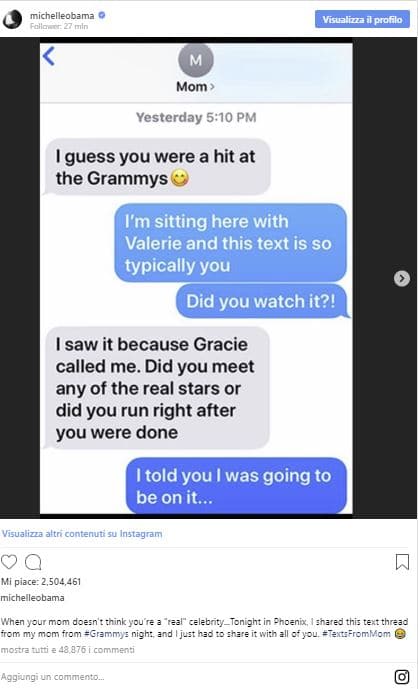 “Quando tua madre non pensa che tu sia una “vera” star”, ha scritto come didascalia allo screenshot. L’ex First Lady, dopo l’apparizione a sorpresa ai Grammy al fianco dell’amica grammy michelleAlicia Keys e delle altre celebrità come JLo, Jada Pinkett Smith e Lady Gaga, ha infatti ricevuto una serie di messaggi.