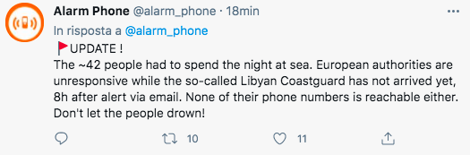 Secondo quanto si apprende, l’appello di Alarm Phone è rimasto inascoltato, le autorità europee non rispondono al sos e la guardia costiera libica non è raggiungibile su nessuno dei numeri forniti. Le 42 persone hanno trascorso la notte tra le onde del mare agitato e nessuno ha ancora provveduto al soccorso.