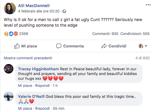 Prima di morire Alli MacDonnell aveva pubblicato sul suo profilo Facebook strani messaggi. Nel post definito “misterioso” che è stato trovato sulla pagina della ex modella c’è una domanda: “Va bene chiamare una donna brutta e cicciona?”, seguita dalla frase: “Queste parole possono spingere le persone sul bordo del precipizio”.