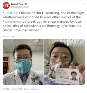 Pochi giorni fa per Li è arrivata la diagnosi di coronavirus, oggi la notizia del decesso del medico-eroe che aveva cercato di metter in guardia sulla minaccia del virus.