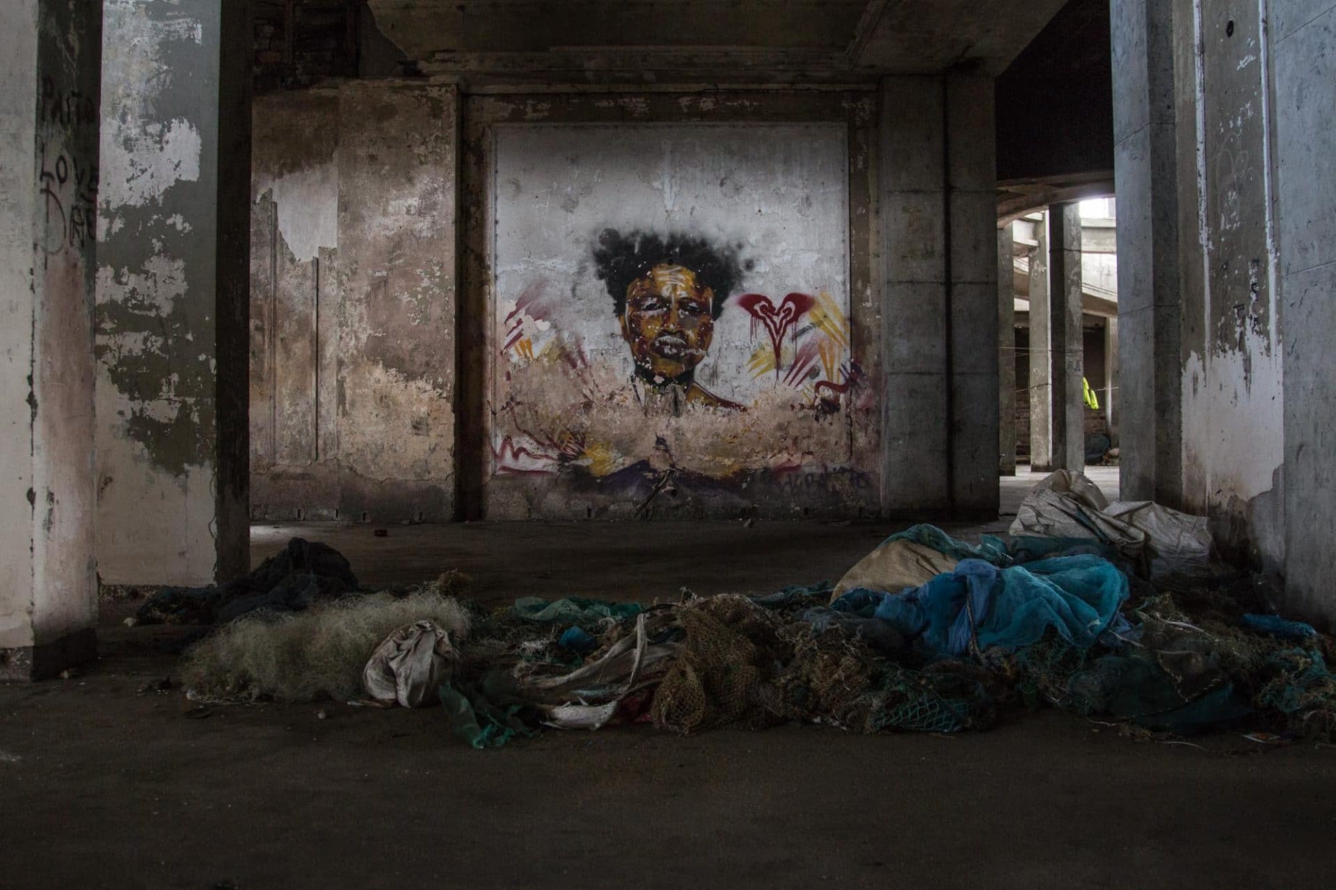 Prendiamo le scale che salgono ai piani superiori, nei larghi corridoi le persone hanno costruito baracche di legno e lamiera che fungono da abitazione e negozio. Un barbiere, un piccolo ristoro costituito da una brace accesa, un banco dove si vende pesce e frutta.