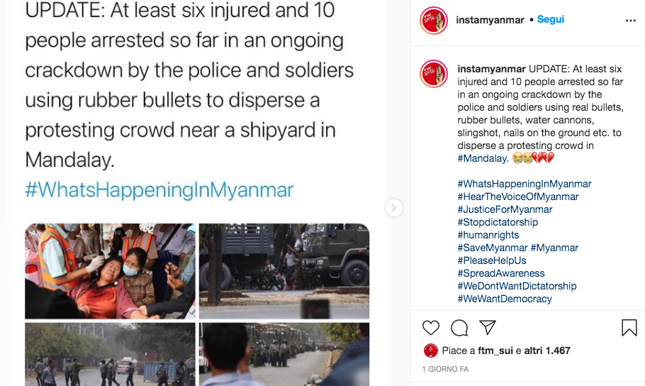 La prossima è fissata per il primo marzo. Secondo l’Assistance Association for Political Prisoners, un’associazione per l’assistenza ai prigionieri politici birmani, dall’inizio del colpo di stato sono state arrestate in tutto 569 persone. Per i media internazionali le manifestazioni di questi giorni sono le più grandi da oltre 10 anni in Myanmar, da quando cioè migliaia di cittadini protestarono contro il governo ispirati dai monaci buddisti e furono repressi dalle autorità militari, nel 2007.