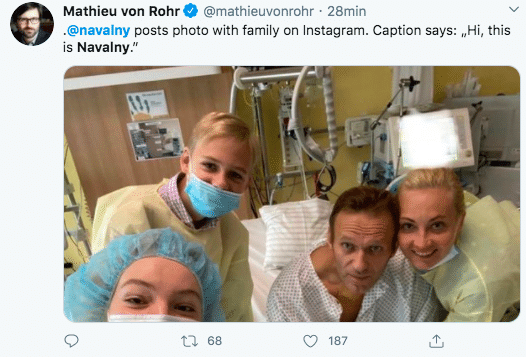 Navalny, prima foto dall’ospedale: “Ciao, mi mancate. Ieri ho respirato da solo tutto il giorno”