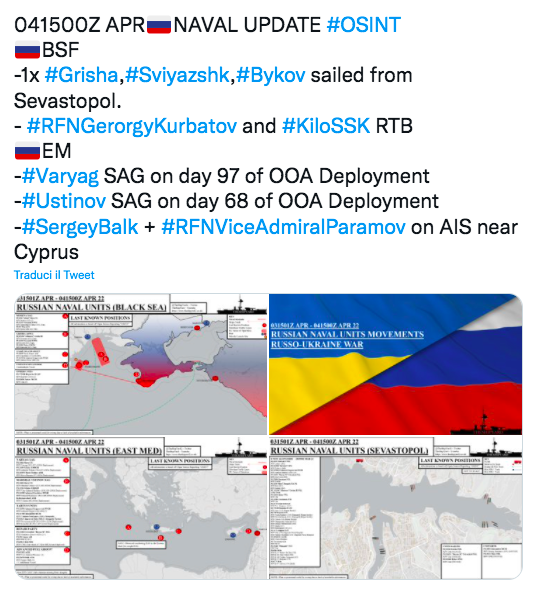 È la sfida navale tra Russia e Nato, che prosegue dall’inizio del conflitto. Da quando la Turchia ha vietato l’attraversamento del Bosforo alle unità militari, la grande flotta russa si muove anche su altri percorsi. Abbiamo parlato del Varyag e del Tributs. Entrambi, dopo aver sostato al largo della Siria, e accompagnati dall’incrociatore Maresciallo Ustinov, dalla fregata Kasatanov e dal caccia Kulikov, sono rientrati nello Ionio. Dove, da giorni, sono stati segnalati con una certa preoccupazione.