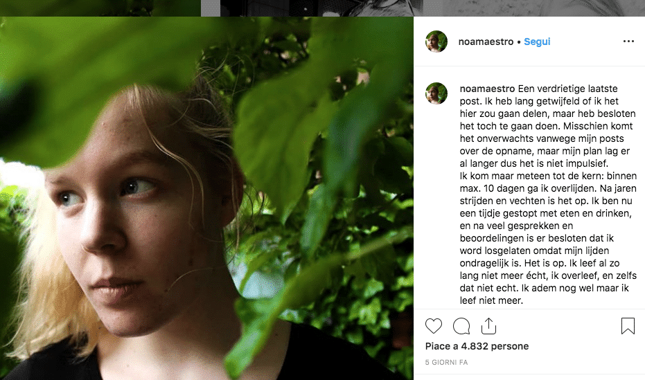 Noa Pothoven storia | Eutanasia Olanda: i numeri sul suicidio assistito – Nel 2018 i casi di eutanasia in Olanda sono diminuiti: i decessi sono stati 4600 contro i 6500 del 2017, che rimane il numero più alto.