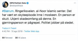 La sparatoria è avvenuta intorno alle 17 al centro islamico di al-Noor, nella cittadina di Baerum, a 13 chilometri dalla capitale norvegese.