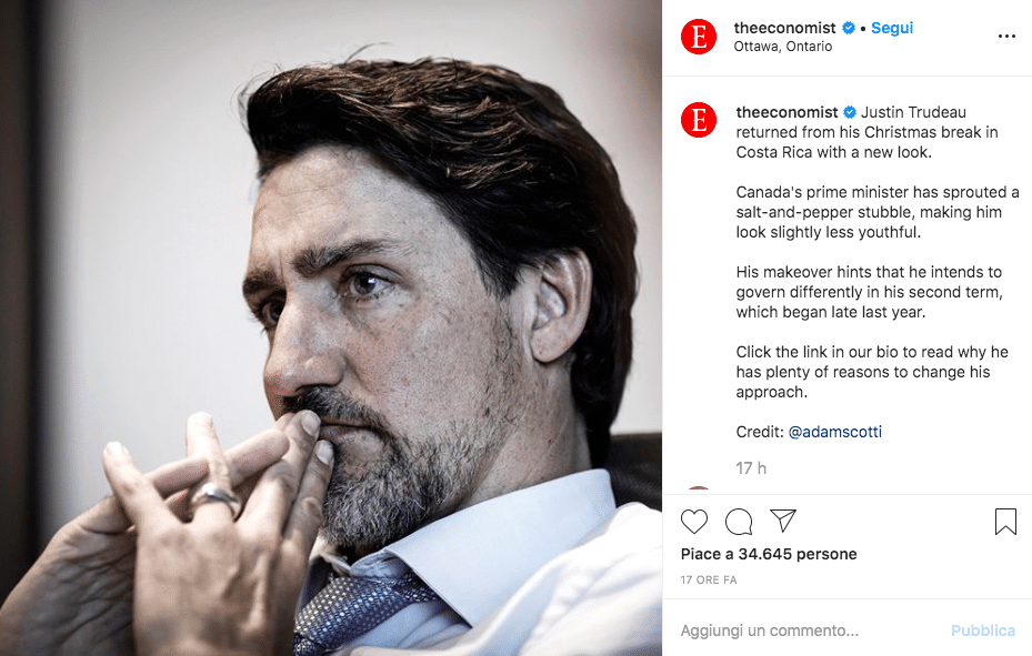 Trudeau ha postato una foto su Instagram in cui compare a lavoro con suoi ministri, pensoso e impegnato. Lo scatto, opera del fotografo personale di Trudeau Adam Scotti, ha colpito tutti per via della nuova barba sale e pepe che gli incornicia il volto.