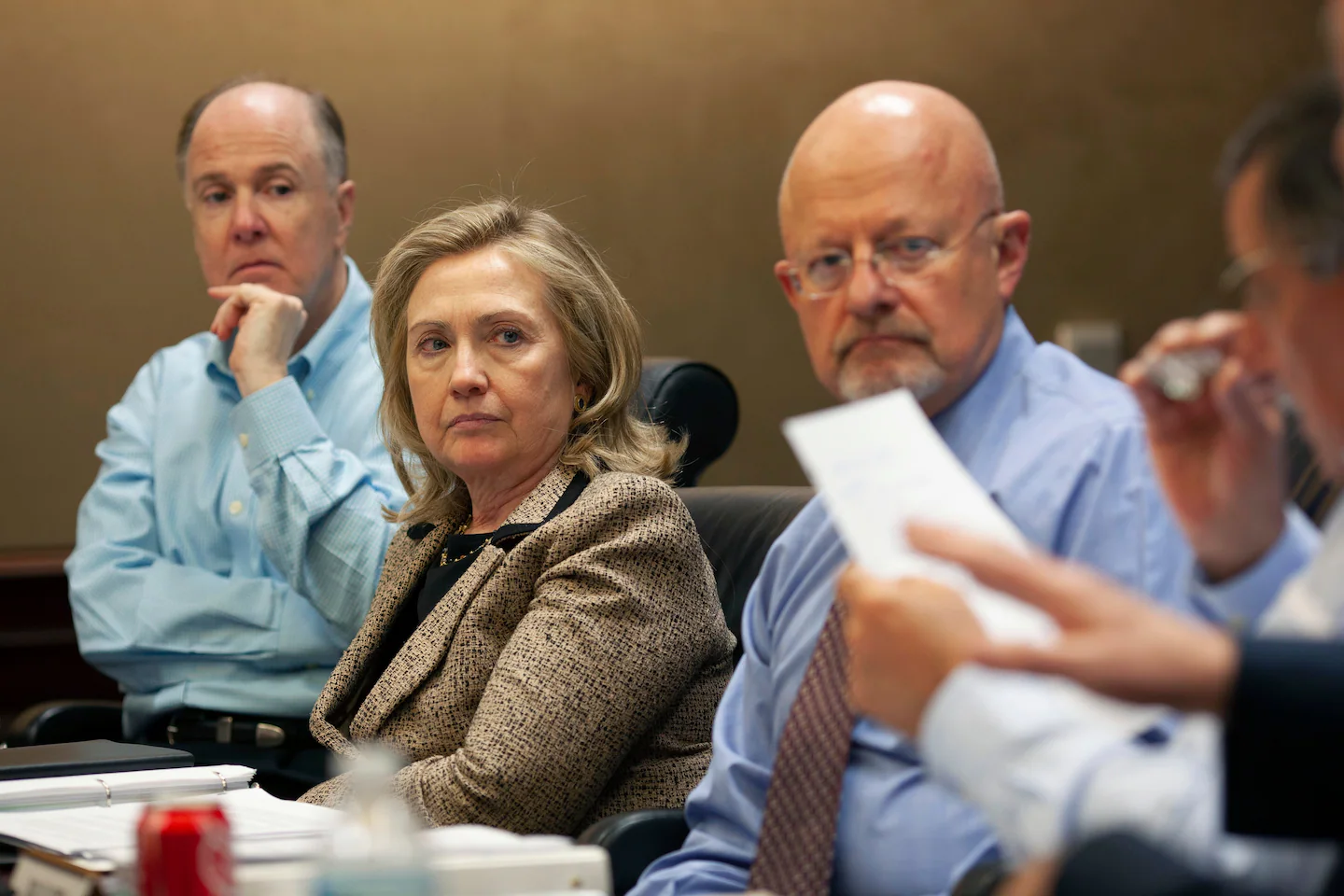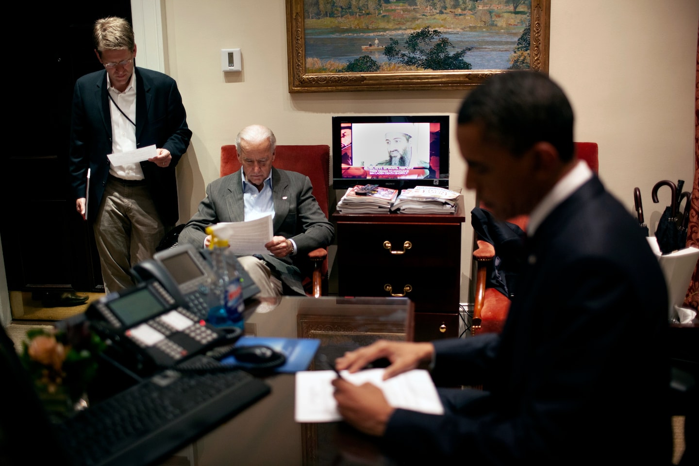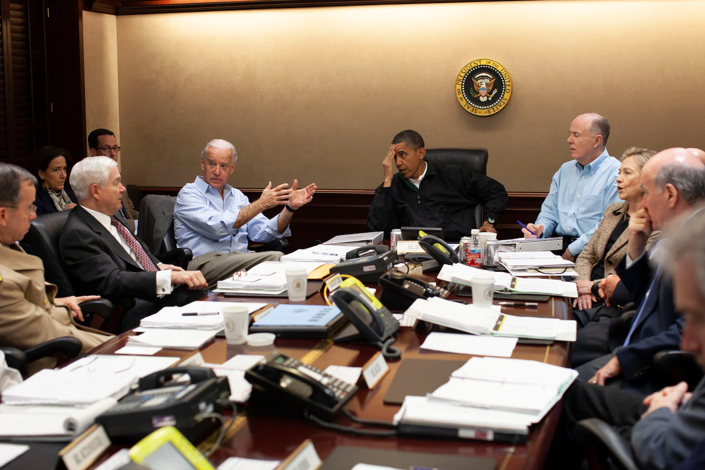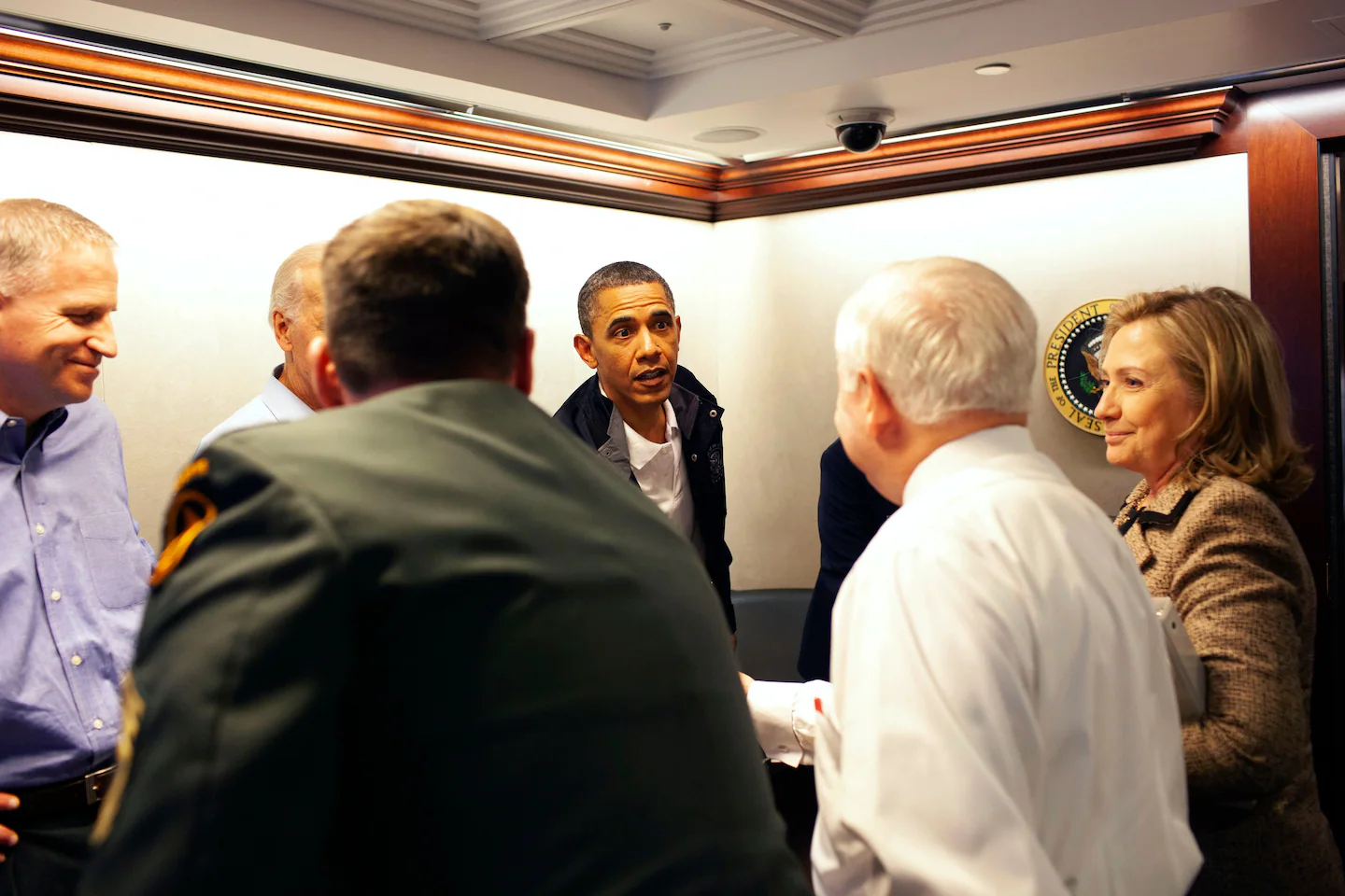 Gli scatti, consegnati al quotidiano dalla Obama Presidential Library sulla base di una richiesta basata sul Freedom Information Act, mostrano Obama riunito insieme ai vertici della sua amministrazione intorno al tavolo della Situation Room già nel primo pomeriggio di quella domenica. Con l’avvicinarsi degli elicotteri alla residenza di bin Laden ad Abottabad, in Pakistan, Obama si è poi trasferito in uno stanzino, da dove il brigadier generale Brad Webb stava trasmettendo le immagini e i filmati dell’operazione condotta dai Navy Seals. Nei minuti successivi, anche gli altri collaboratori di Obama si sono stretti nella stanza, dove sono stati immortalati nel celebre scatto di Pete Souza, fotografo capo della Casa Bianca.
