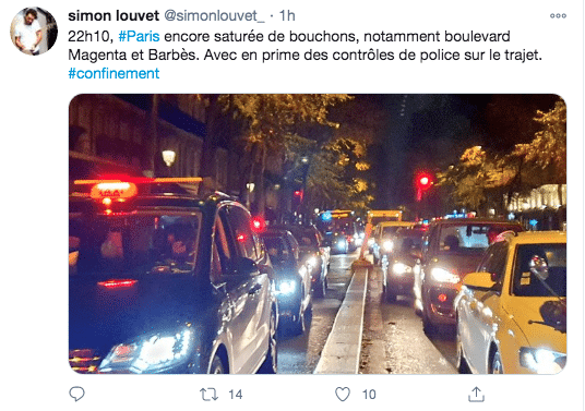 “Ore 22.10, Parigi è ancora intasata dagli ingorghi, in particolare su Boulevard – viale – Magenta e Barbès. Con l’aggravante dei controlli della polizia in arrivo”, ha scritto un utente su Twitter. Tra i cittadini bloccati nel traffico anche coloro che cercano di rientrare in casa dopo aver trascorso l’ultimo giorno di libertà prima della chiusura usufruendo degli esercizi commerciali ancora aperti.