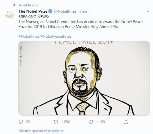 Premio Nobel per la pace 2019 al premier etiope Abiy Ahmed