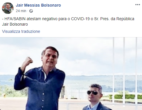 Il presidente del Brasile Jair Bolsonaro è negativo al test per il Coronavirus- Lo riferisce lo stesso presidente su Facebook smentendo le notizie circolate nelle scorse ore su media brasiliani, tra cui il giornale Jornal o dia, che avevano dato notizia della sua positività.