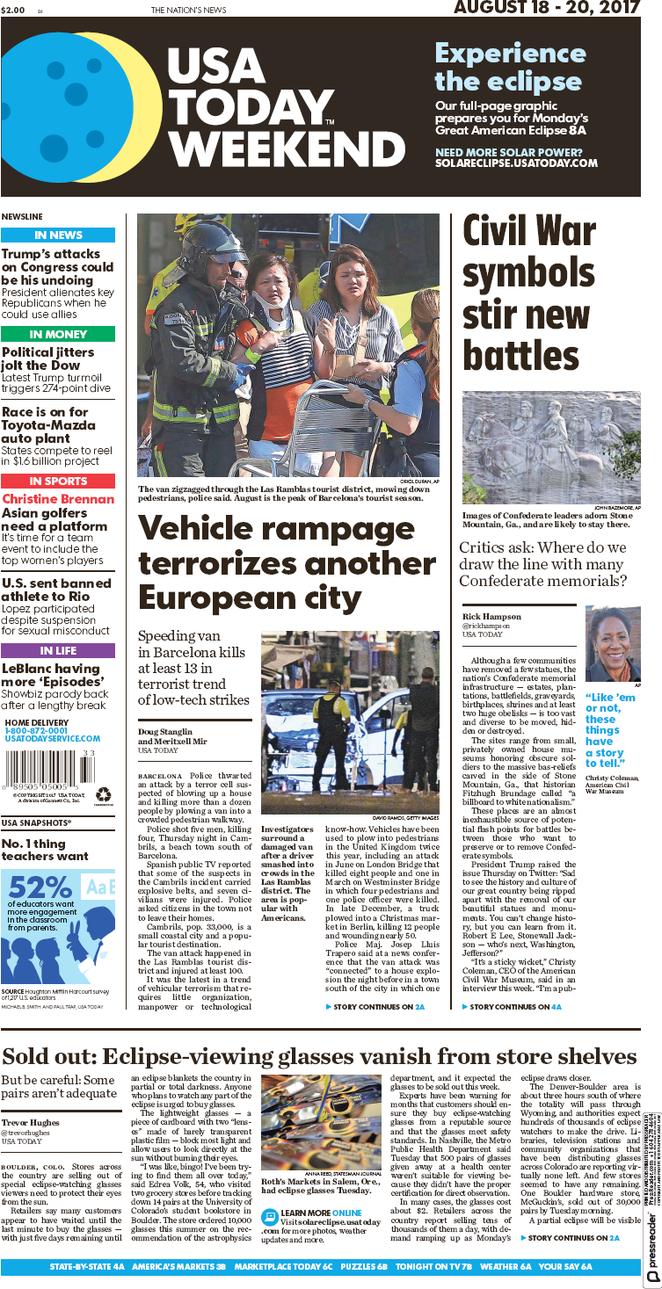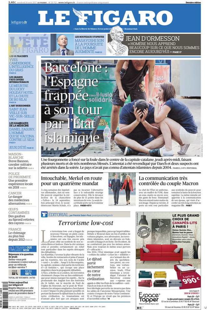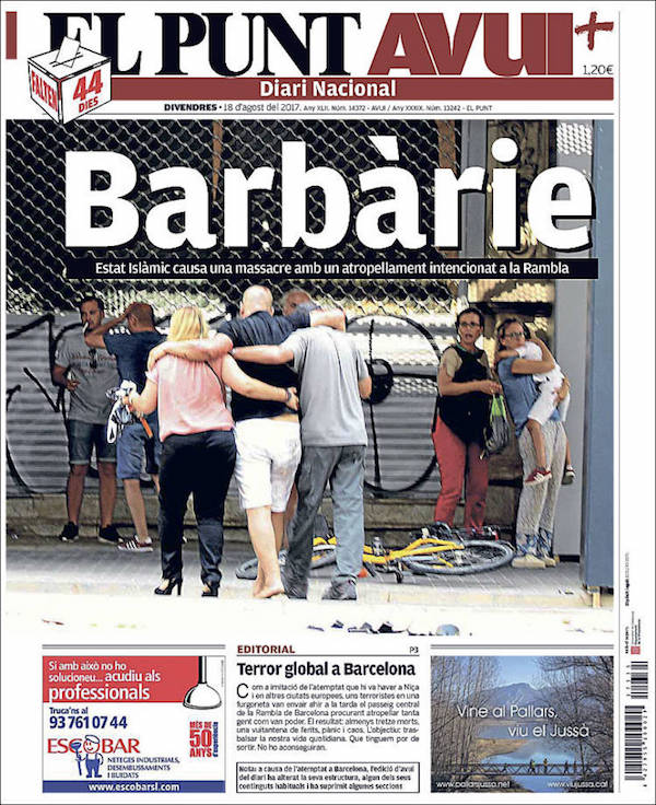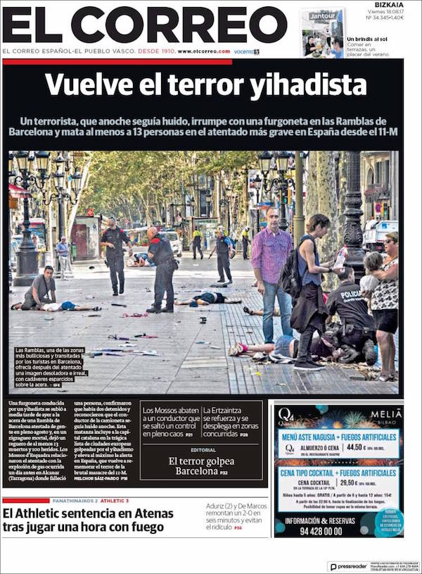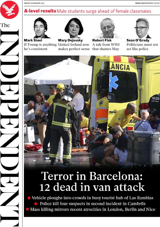 Tra il pomeriggio del 17 agosto e le prime ore del giorno seguente, la Spagna è stata colpita da due attacchi terroristici che hanno provato 14 morti e 130 feriti. Così le testate spagnole e internazionali hanno trattato la notizia questa mattina: