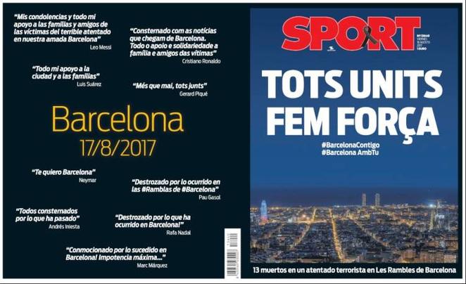 La prima pagina di @marca di oggi – principale quotidiano sportivo spagnolo – “Oggi non possiamo parlare di sport” #Barcelona #Barcellona pic.twitter.com/10wTz9VuAF