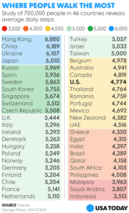 L’Italia è piuttosto ben posizionata nella classifica, piazzandosi con 5.296 passi al giorno al tredicesimo posto sui 46 paesi coinvolti.