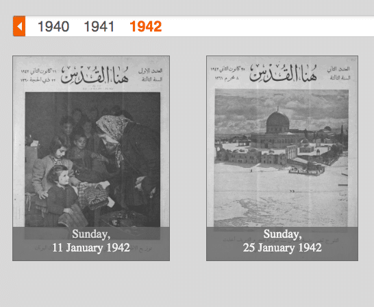 Come testimonia questa copertina della rivista palestinese Huna Al Quds dell’11 gennaio 1942, ai rifugiati in arrivo dalla Grecia venivano distribuiti vestiti e alimenti. La didascalia sotto la foto dice “distribuzione di cibo e abbigliamento in Siria ai rifugiati arrivati dalla Grecia”.