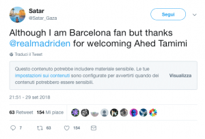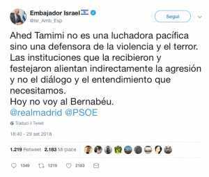 “Ahed Tamimi non combatte per la pace, promuove la violenza e il terrore. Le istituzioni che l’hanno ricevuta e celebrata incoraggiano indirettamente l’aggressione e non il dialogo e la comprensione che ci serve. Oggi non vado al Bernabeu”, ha twittato sabato Daniel Kutner, l’ambasciatore israeliano in Spagna.