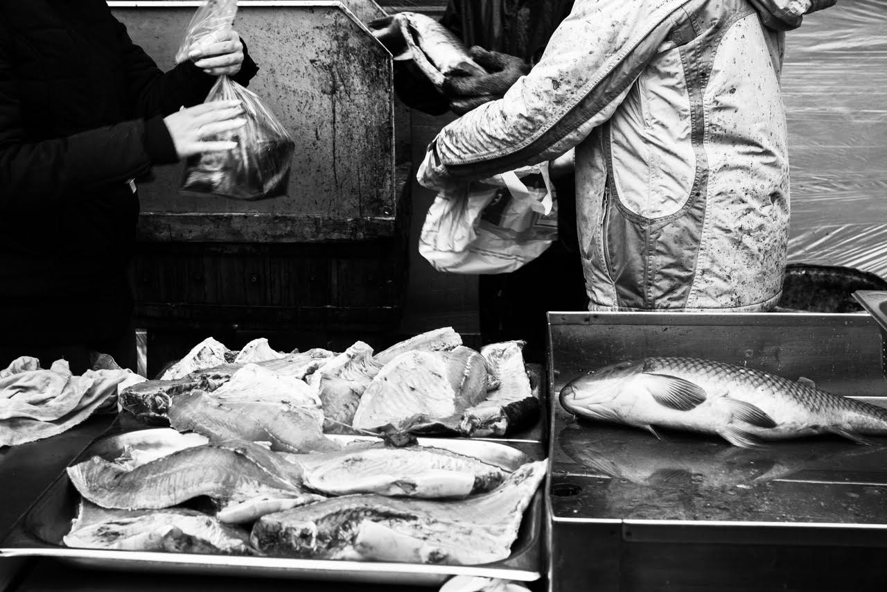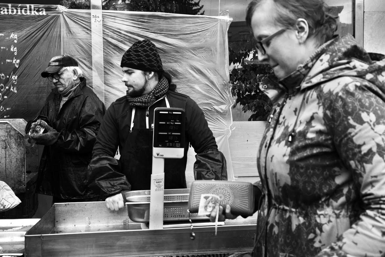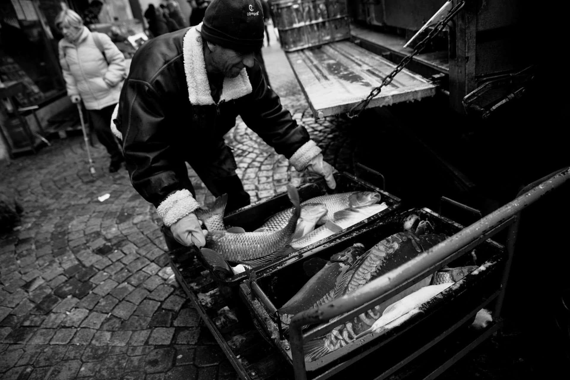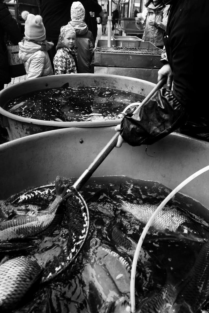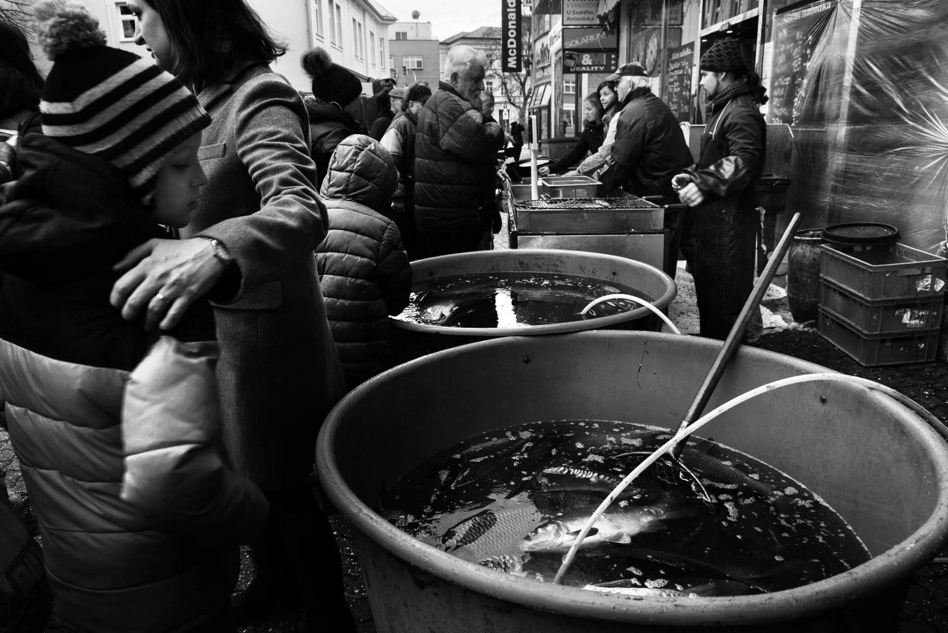Zlín, Repubblica Ceca – Due robuste mani tatuate stanno mettendo una carpa viva sulla bilancia, appena oltre, nella piccola casetta in legno allestita nel bel mezzo del parcheggio del centro commericiale, le acque di una grossa tinozza sono agitate da una fitta angoscia ittica. La bilancia dice la sua verità, il venditore solleva l’animale e ruota su se stesso. Con le spalle al mondo e la preda all’ombra del corpo, fa sapere al primo della fila: “Tre chili e settantasei!”. A quel punto il braccio del’uomo si solleva in direzione del cielo, e un attimo dopo si abbatte con legno mortale sul cranio del pesce, liberando nell’atmosfera grigia un rumore definitivo.