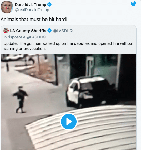 Quel video ha subito scatenato la furia di Donald Trump: “Animali da colpire duramente”, ha twittato rilanciando quelle immagini: cavalcando l’attacco nonostante ancora non se ne sappia la natura, nel pieno della campagna all’insegna dello slogan “Law and Order”, legge e ordine. E infatti, in un tweet successivo, ha scritto: “Se muoiono, pena di morte per il killer”.