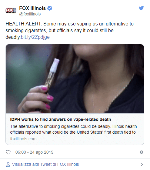 Il centro per il controllo e le prevenzioni delle malattie (Cdc) lancia un allarme e denuncia che altre 200 persone si sono ammalate in tutto il Paese per via della sigaretta elettronica. “Questa tragica morte in Illinois rafforza i seri rischi associati ai prodotti di sigarette elettroniche”, ha detto Robert Redfield direttore del Cdc. “Siamo rattristati dalla notizia della prima morte correlata ad una grave malattia polmonare per chi usa sigarette elettroniche o dispositivi per svapare”.