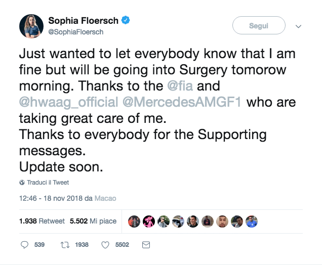 Il giorno dopo l’incidente la pilota Sophia Floersch ha subito una lunga operazione della durata di 11 ore. La giovane atleta non ha subito la lesione del midollo spinale che si temeva. Secondo le prime indiscrezioni riportate dalla stampa tedesca, le condizioni della 17enne pilota tedesca sono positive.