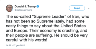 “Il cosiddetto ‘Leader Supremo’ dell’Iran, che ultimamente non è stato così Supremo, ha avuto cose molto gravi da dire sugli Stati Uniti e l’Europa”, si legge nel tweet. La loro economia sta collassando e il loro popolo sta soffrendo. Dovrebbe stare molto attento con le sue parole!”.