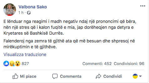In un'intervista all'emittente tv albanese Top Channel, la sindaca Valbona Sako, in carica da appena 4 mesi, aveva detto tra l'altro che "dobbiamo essere soddisfatti anche di 50 vittime". Poi il post su Facebook con le dimissioni