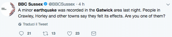 L’aeroporto di Gatwick ha confermato la scossa della notte ma ha precisato che né le anormali attività lavorative né i voli sono stati interrotti.