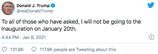 “Per tutti coloro che se lo stessero chiedendo, non andrò alla cerimonia di insediamento il 20 gennaio“. Lo scrive su Twitter il presidente uscente Usa, Donald Trump dopo l’assalto al Congresso Usa. Giusto ieri, nel pomeriggio di giovedì 7 gennaio (la notte tra il 7 e l’8 in Italia), Trump aveva riconosciuto per la prima volta, pur senza nominare mai Biden, la sconfitta alle elezioni presidenziali e aveva lanciato un tardivo appello alla riappacificazione. Le parole del presidente uscente erano arrivate a sorpresa, quando sul suo profilo Twitter, tornato online dopo il blocco del suo account deciso in seguito all’assedio dei suoi supporter a Capitol Hill (qui le foto e i video dell’attacco), è apparso un video di poco più di due minuti.