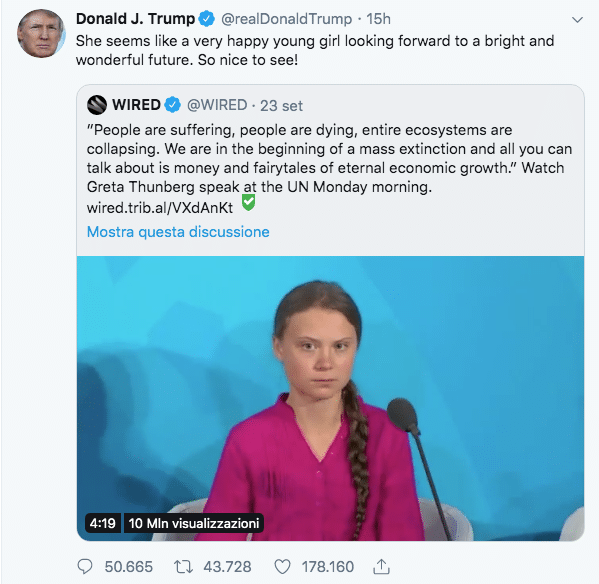 “Sembra una ragazzina molto felice piena di speranza per un bellissimo e brillante futuro”, ha scritto ironicamente il presidente Trump, pubblicando su Twitter un video dell’appassionato discorso della 16enne svedese alle Nazioni Unite.