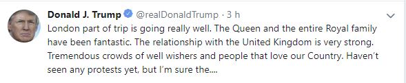 “La regina e l’intera famiglia reale sono state fantastiche. La relazione con la Gran Bretagna è molto forte” ha scritto Trump.