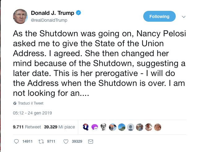 Il presidente Donald Trump ha ceduto. Dopo le pressioni dello speaker della Camera dei rappresentanti, Nancy Pelosi, il Tycoon ha annunciato il rinvio del discorso sullo Stato dell’Unione previsto per il 29 gennaio. “Farò il discorso quando lo shutdown finirà”, ha annunciato su Twitter l’inquilino della Casa Bianca. Pelosi gli aveva negato la possibilità di tenere alla Camera l’intervento sul bilancio dell’anno e sulle prospettive future “perché il governo è chiuso” per mancanza di fondi.